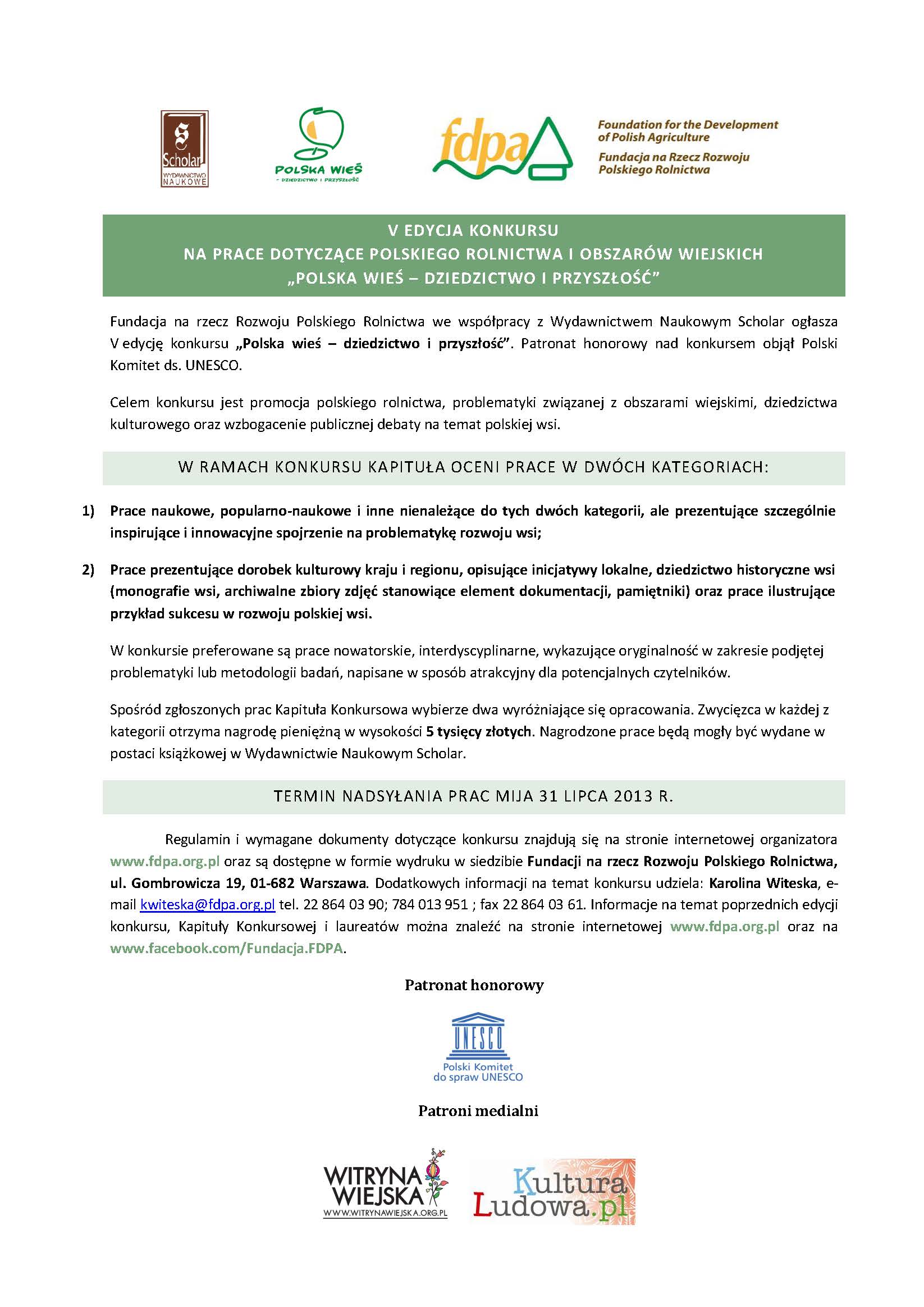 Fundacja na rzecz Rozwoju Polskiego Rolnictwa we współpracy z Wydawnictwem Naukowym Scholar ogłasza V edycję konkursu „Polska wieś – dziedzictwo i przyszłość”. Patronat honorowy nad konkursem objął Polski Komitet ds. UNESCO.