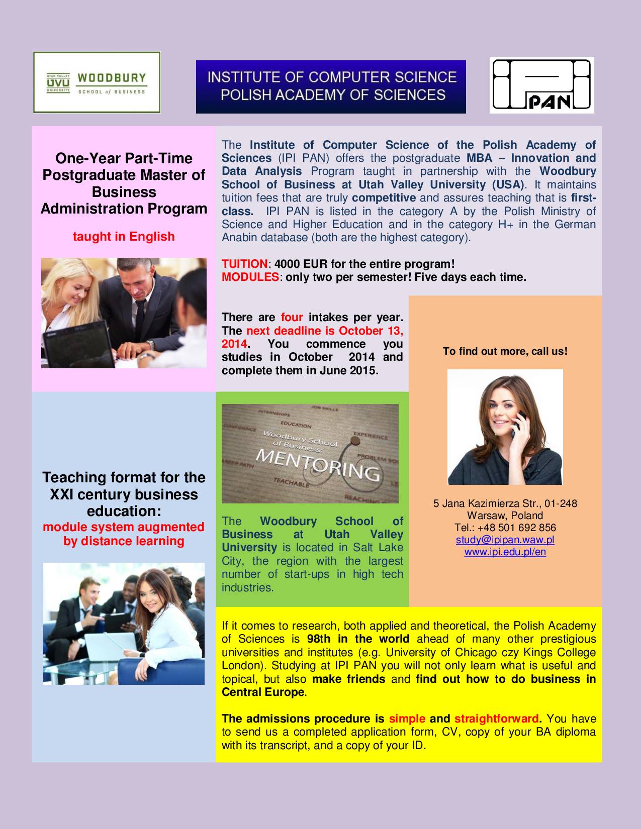 The Institute of Computer Science of the Polish Academy of Sciences (IPI PAN) offers the postgraduate MBA
