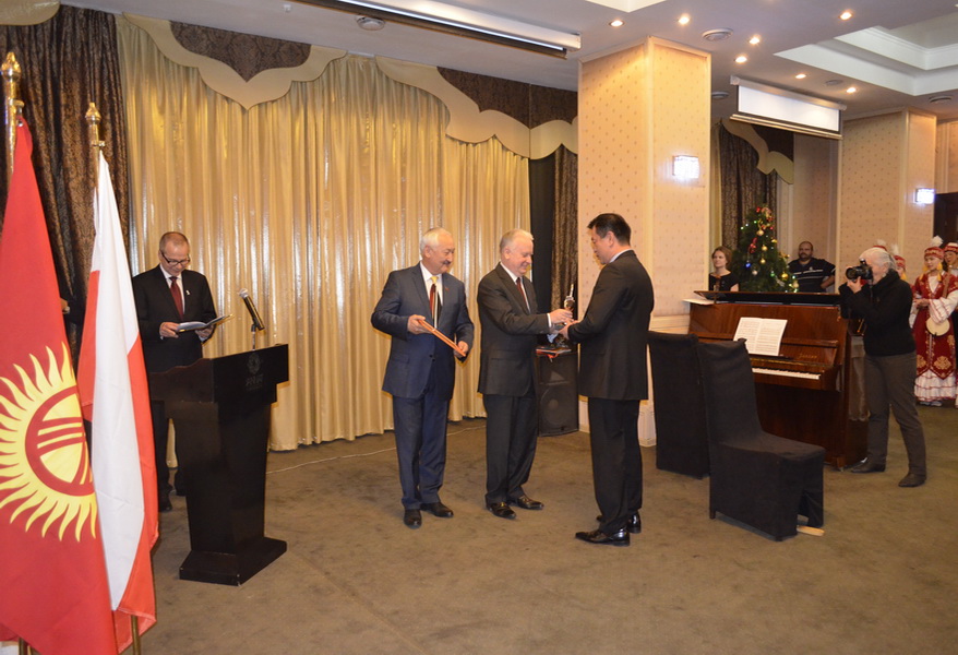 В первой части «Вечера Польско-Кыргызского Бизнеса» Господин Посол вручил кыргызским и польским фирмам награды «За высокие достижения в развитии кыргызско-польского экономического сотрудничества». Данная награда – это отличие тех предпринимателей, которые своей деятельностью способствовали увеличению товарооборота в 2013 году между Кыргызстаном и Польшей, многолетней деятельности на рынке, а также развитию и укреплению экономических, торговых и международных взаимоотношений между нашими странами. Организация таких Вечеров под конец года, дает возможность подвести итог своей работы польским и кыргызским предпринимателям, а также динамично развивающимся польско-кыргызским отношениям. Кыргызскую сторону на бизнес вечере представлял Эсенгул Исаков, Член Комитета ЖК КР по аграрной политике, водным ресурсам, экологии и местному самоуправлению.